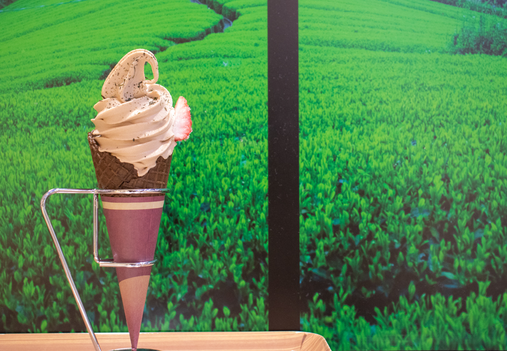 ソフトクリームの上には、パリパリに凍らせた「つゆひかり」の茶葉をトッピング。食感のアクセントと、しっかりとした苦みが紅茶ソフトの味わいをいっそう引き立てます。(※北條社長曰く、「これがお茶屋としてのアイデンティティを表している」とのこと。)