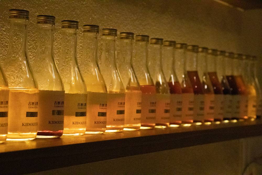 ▲The aged sake from Kidoizumi Brewery. Its amber hue deepens with the length of maturation, creating a beautiful gradation that delights the eyes as much as the palate.